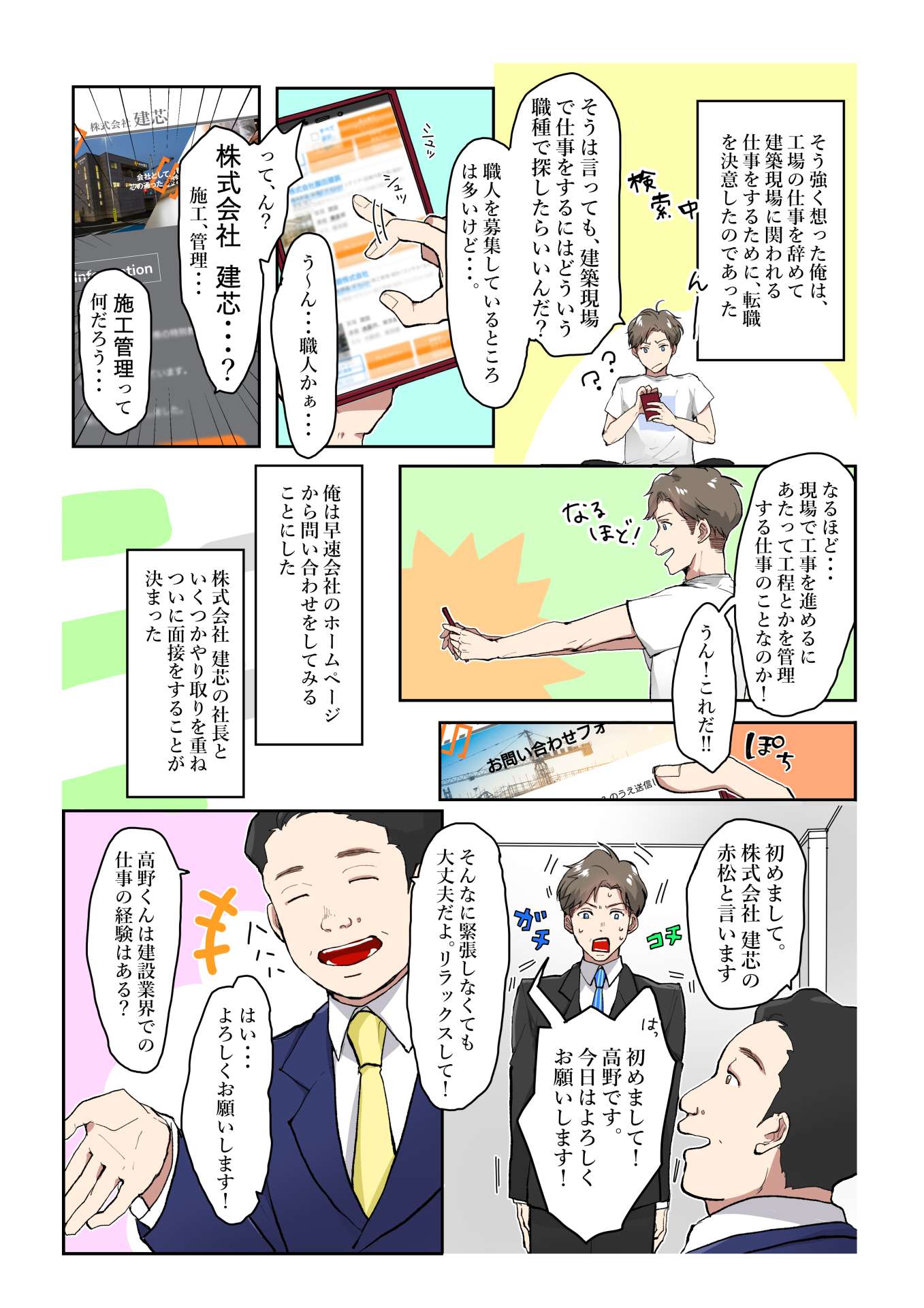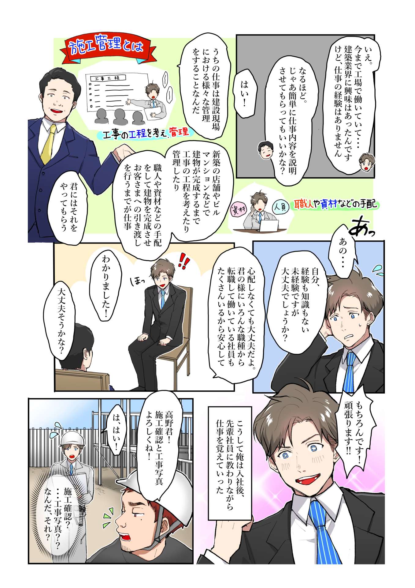 赤松「新築の店舗やビル、マンションなどで、建物が完成するまで工事の工程を考えたり管理したり、職人や資材などの手配をして建物を完成させ、お客様への引き渡しを行うまでが仕事。…君にはそれをやってもらう」