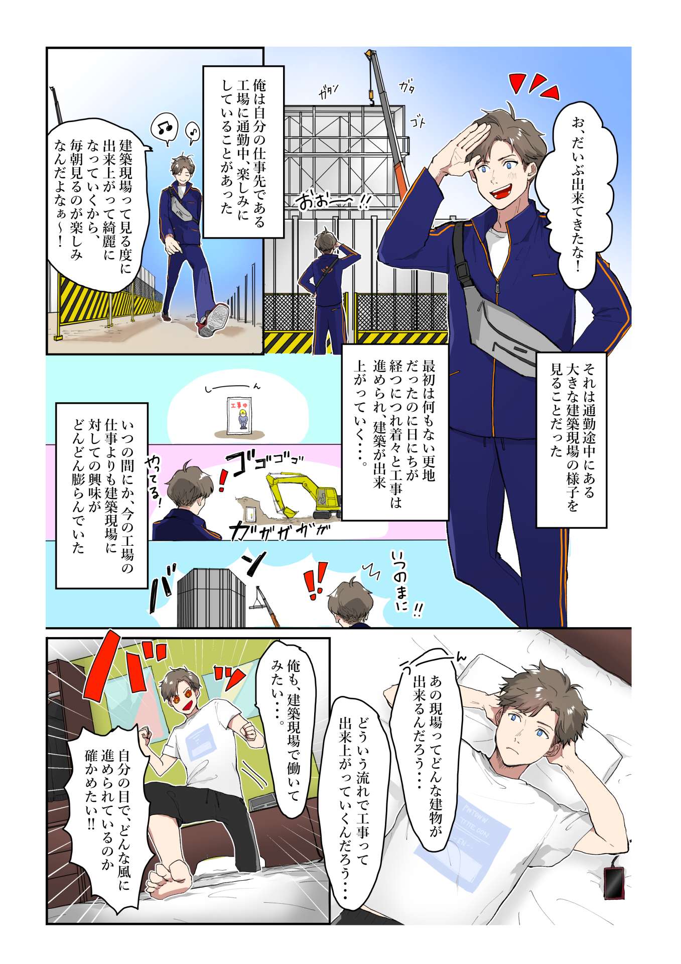 男性『最初は何もない更地だったのに、日にちが経つにつれ着々と工事は進められ、建物が出来上がっていく…。いつの間にか、今の工場の仕事よりも、建築現場に対しての興味がどんどん膨らんでいた』